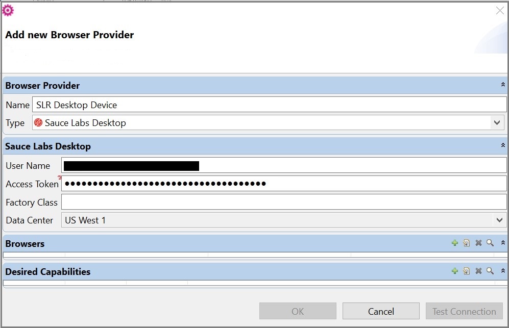 Add your Sauce Labs details to connect to Sauce Labs, including Factory Class if applicable.