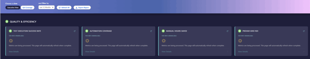 Introducing the new Quality Hub Dashboard! As a part of our 3.22.0 release, we announced the Executive View for our Quality Hub Dashboard. The QA Coverage view will be released at a later date, so stay tuned!