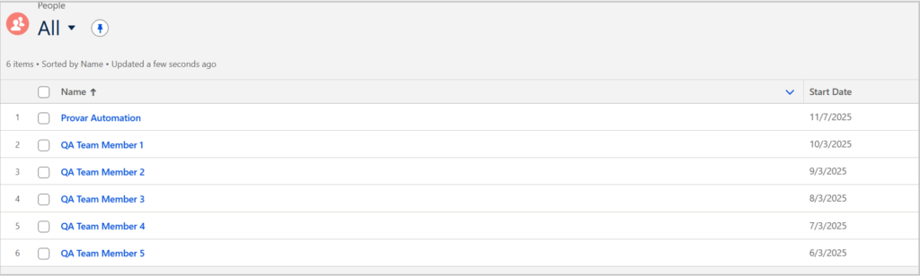 For instance, in the above example, our automation coverage has grown from 4% → 68%, marking a 1488.9% increase overall! However, if you look at the efficiency gain, it shows a 14% (point NOT % based on coverage) increase in individual member efficiency, as we have gone from 0->5 team members. Team members are tracked through the Person object, and each record is linked to a Salesforce user. See the example list below that showcases each members start date and how this factors into the efficiency gain metric: