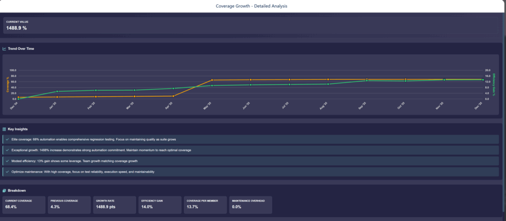 This metric card shows the combined metrics of automation coverage growth and efficiency gain of your QA team over a defined period of time.