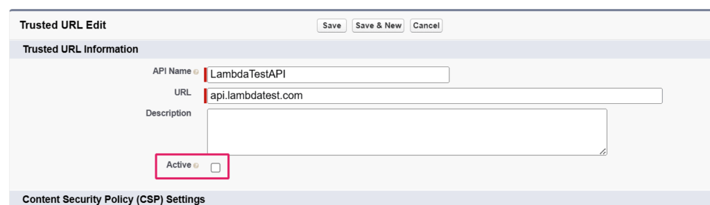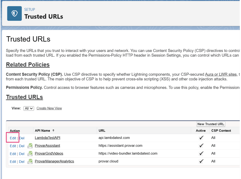 Navigate to Setup → Trusted URLs → LambdaTestAPI and click Edit.