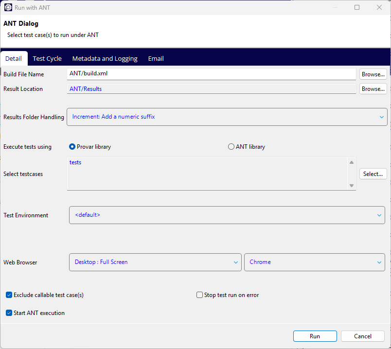 In particular, note the ‘Start Ant execution’ checkbox at the bottom of the window. If ticked, Test Case execution will be initiated through ANT as soon as the ‘Run’ button is clicked. If ‘Start Ant execution’ is not ticked, the Build File will be created without executing the Test Cases. This is useful if you want to make the Build File to be run on a different machine.