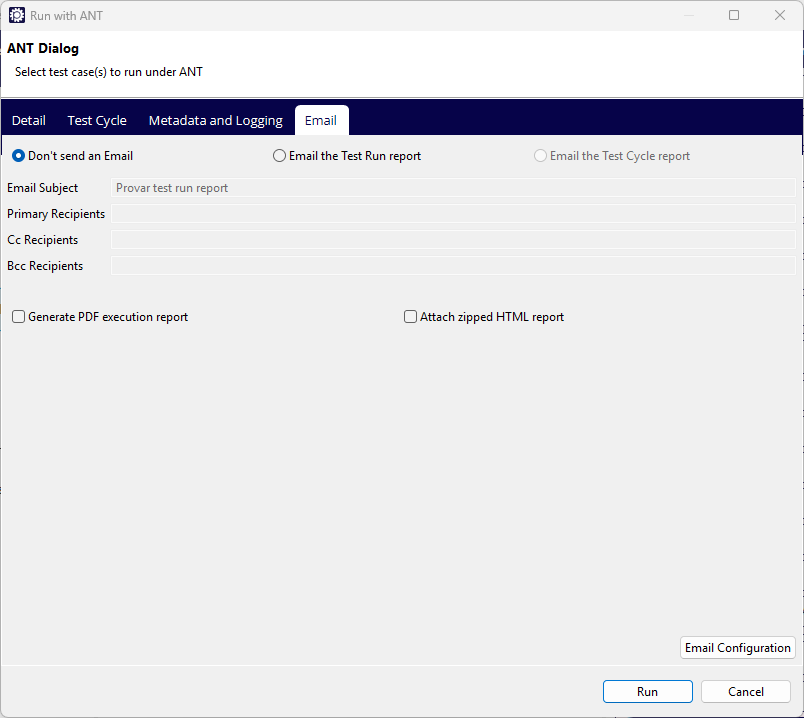 Click the Email tab on the ANT Dialog window to set up an email report.